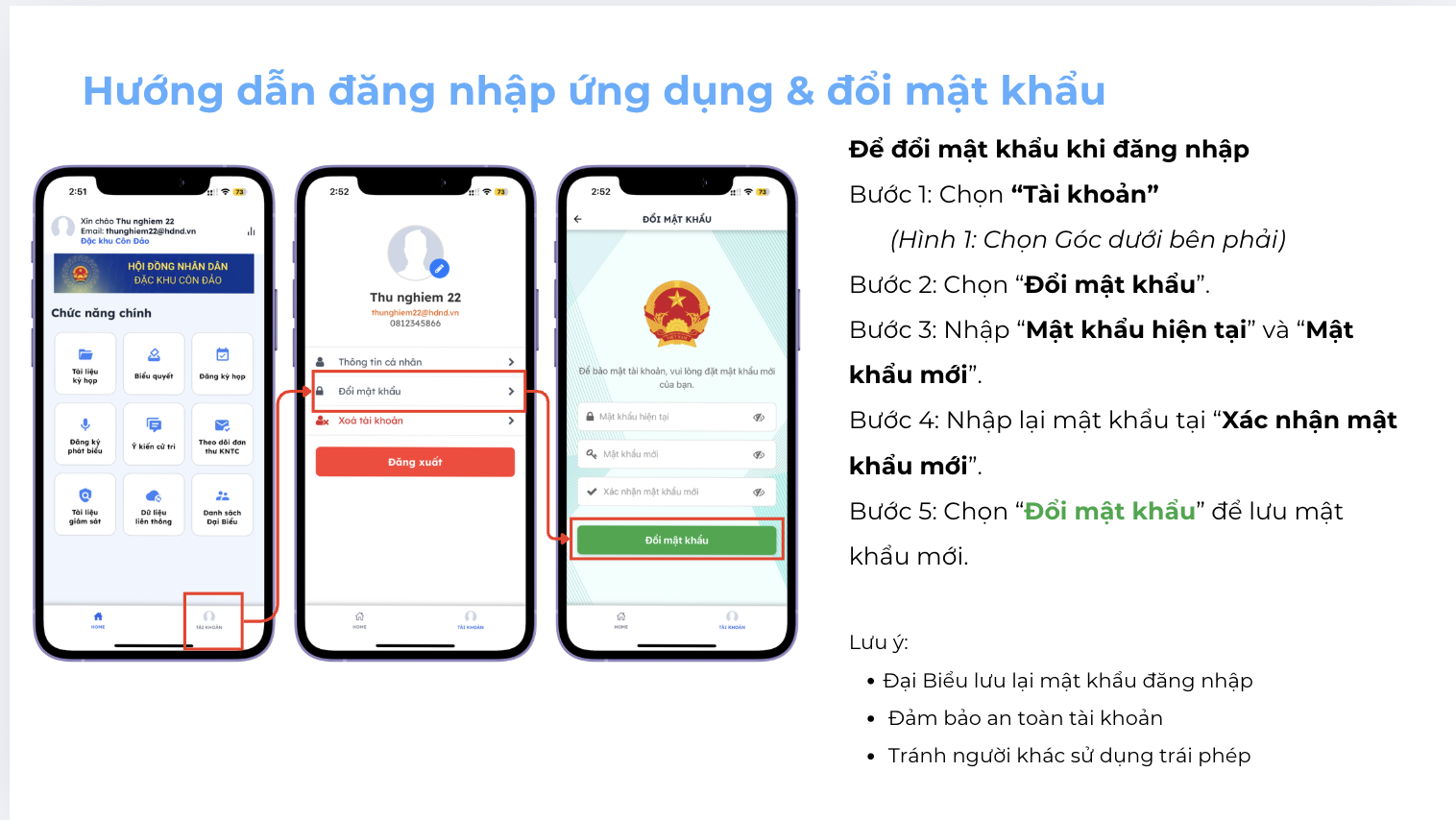Để đảm bảo an toàn tài khoản và tránh trường hợp người khác đăng nhập trái phép, Đại biểu HĐND nên thay đổi mật khẩu định kỳ hoặc ngay khi nghi ngờ thông tin đăng nhập bị lộ. Dưới đây là hướng dẫn chi tiết cách đổi mật khẩu trực tiếp trên ứng dụng di động.