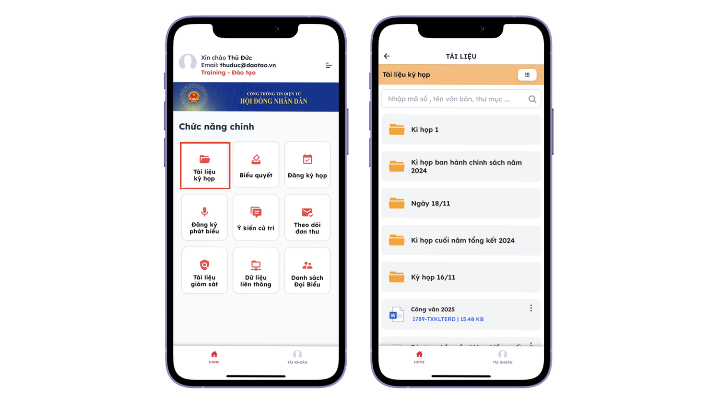 • Tài liệu kỳ họp: Chứa các báo cáo, tờ trình, dự thảo nghị quyết. Đại biểu bấm vào để mở xem trực tiếp nội dung chi tiết.