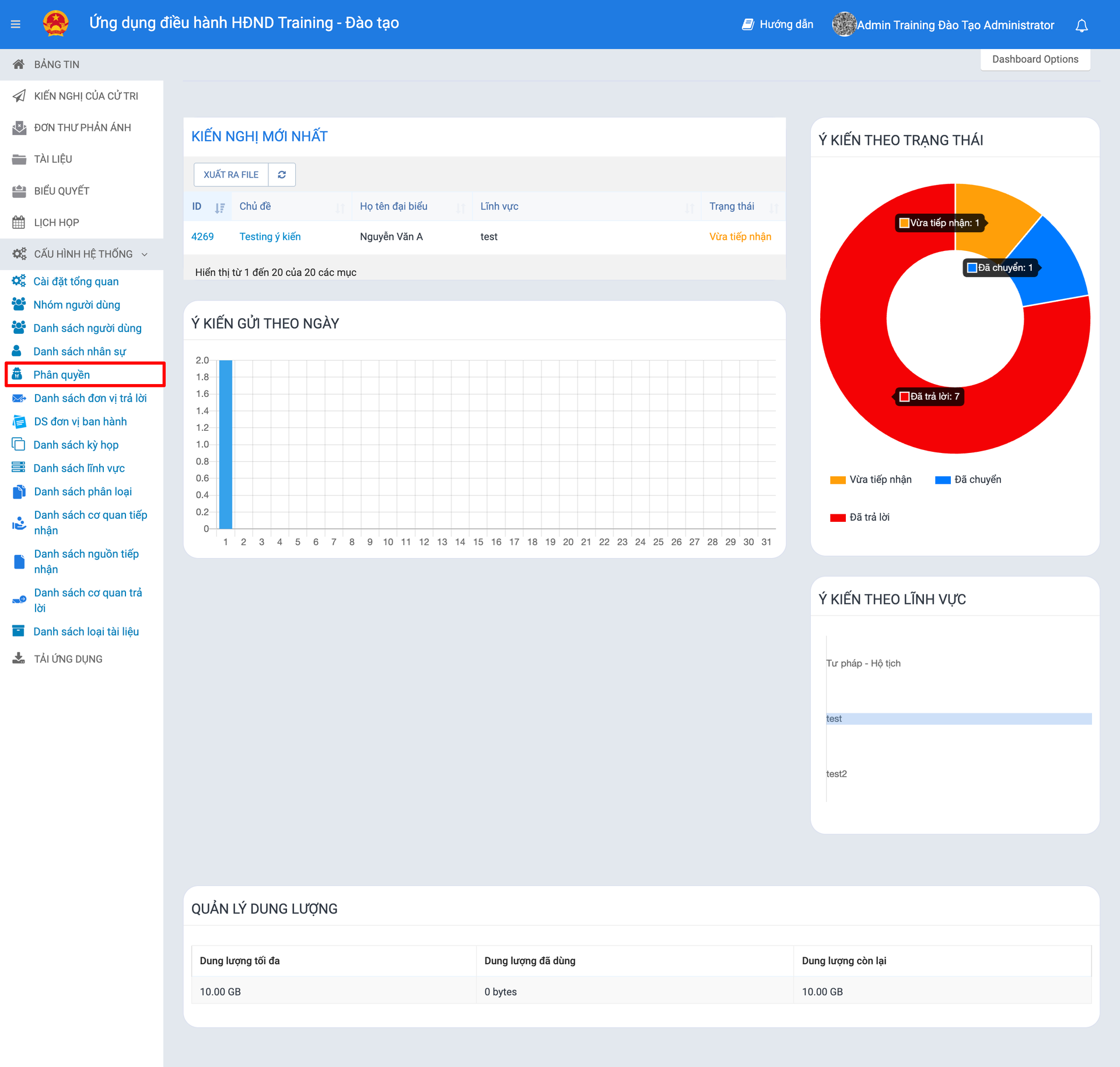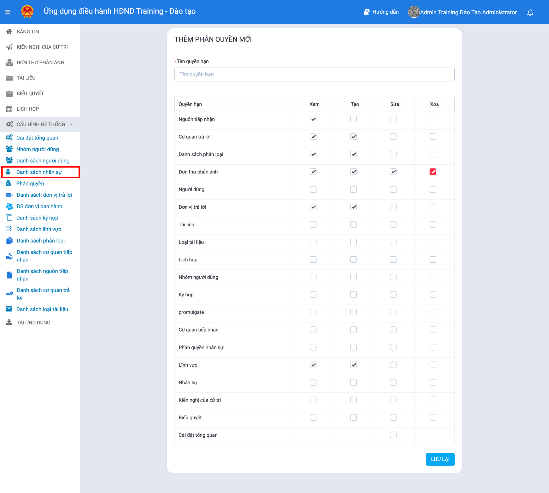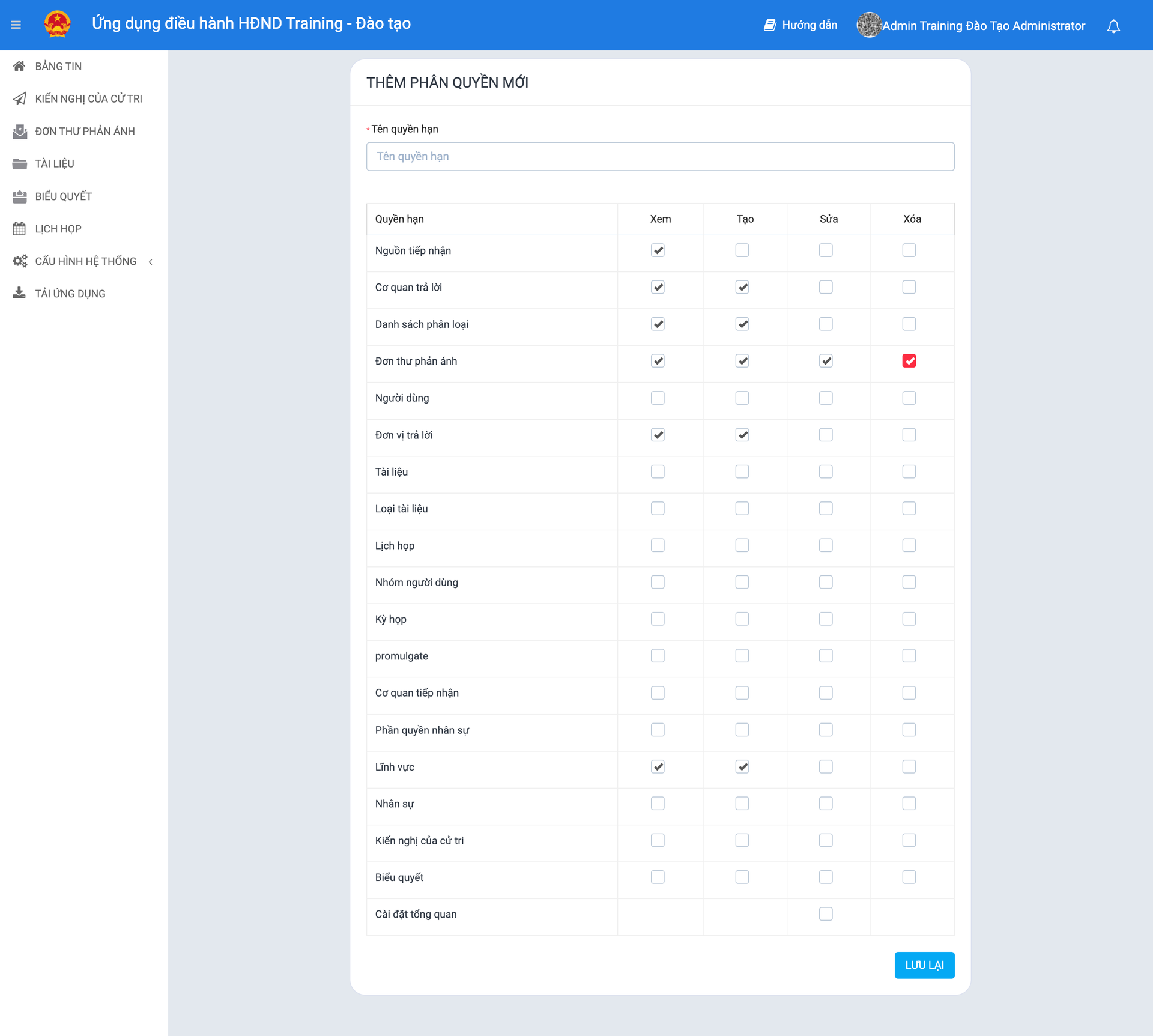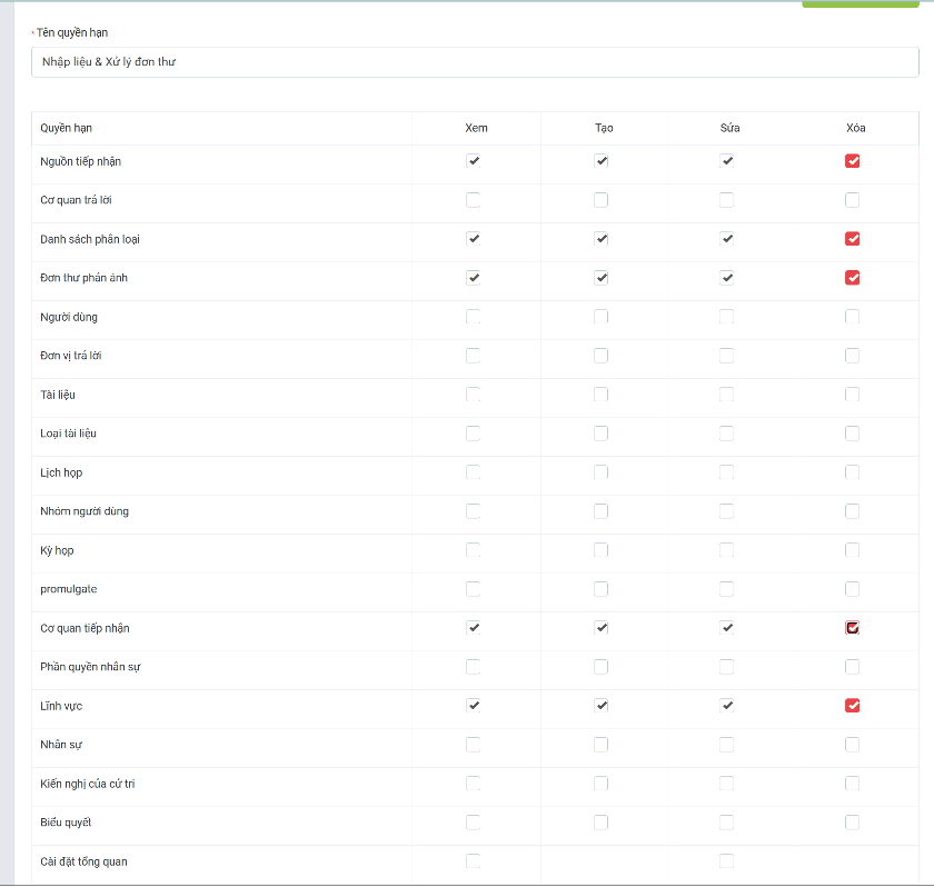 Ví dụ: Quản trị viên muốn tạo một phân quyền cho nhân sự nhập liệu "Đơn thư phản ánh". Quản trị viên lựa chọn các nội dung sau: