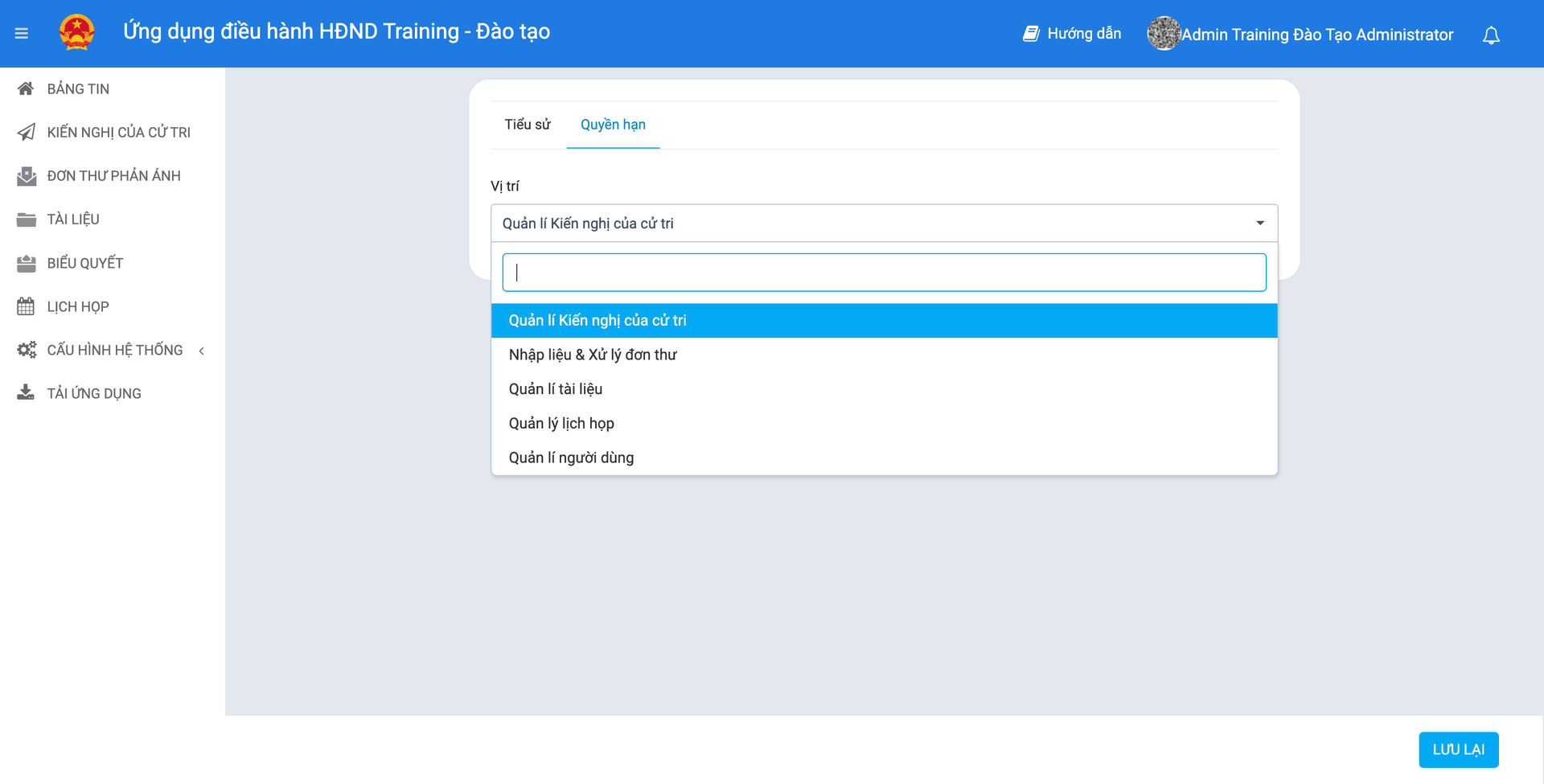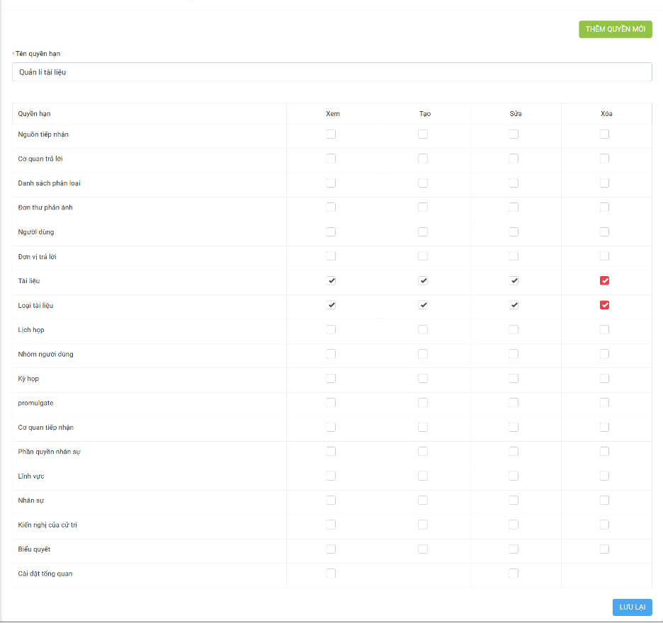 - Tích chọn quyền (Xem/Thêm/Sửa) tại các mục: Lĩnh vực, Phân Loại, Cơ quan tiếp nhận, Nguồn tiếp nhận.
