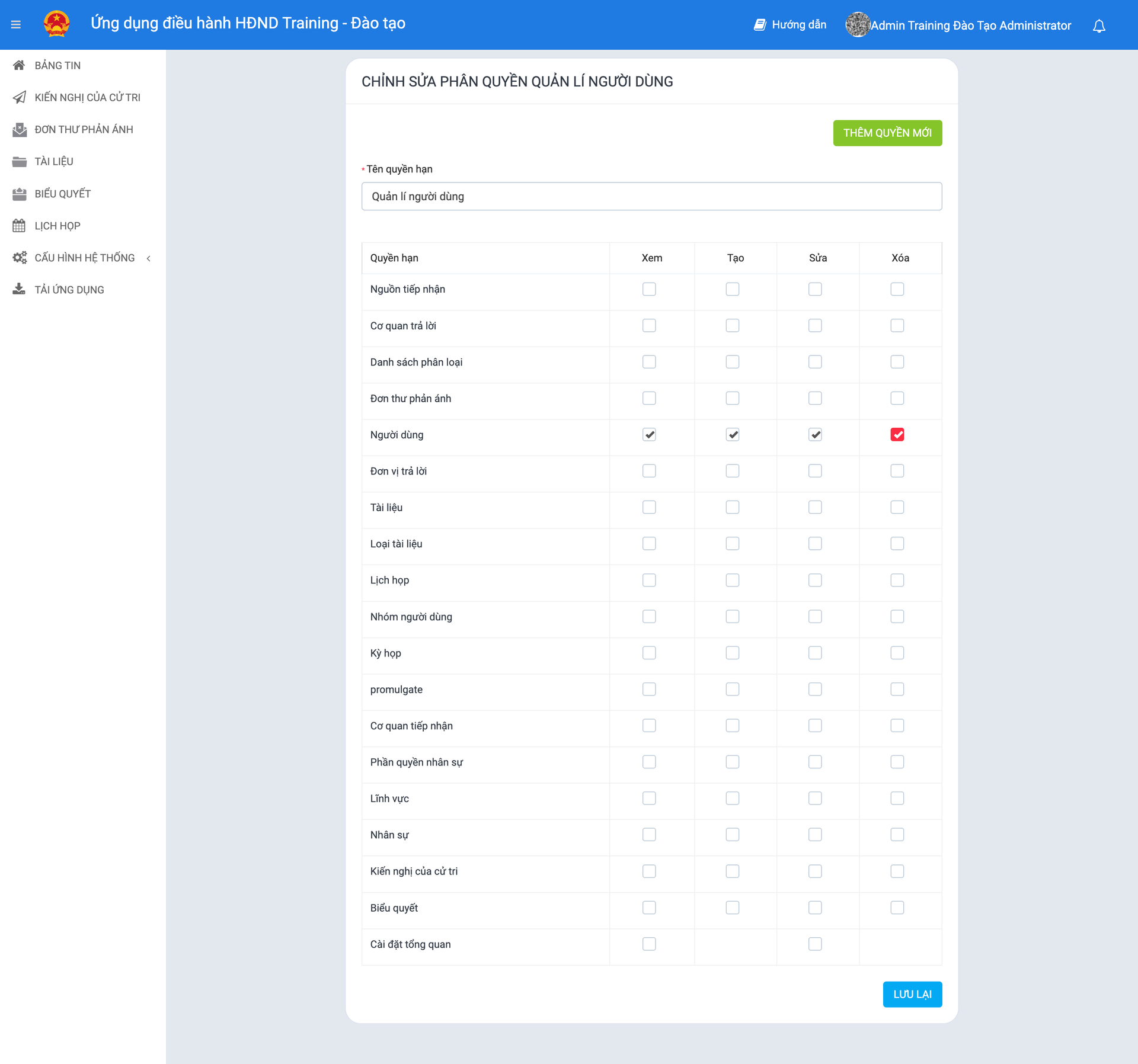 Cấu hình: Tại phần cài đặt quyền, tích chọn tất cả các ô: Xem, Tạo, Sửa, Xóa trong mục Người dùng.