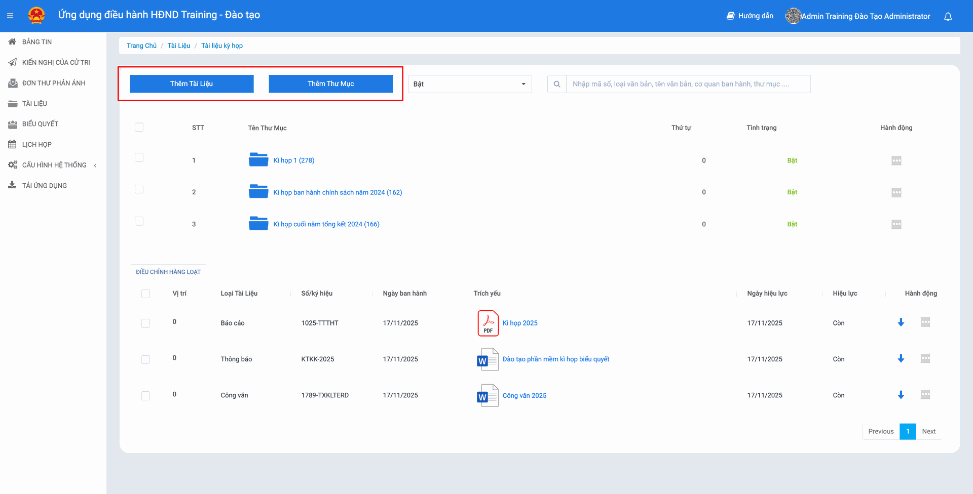 Tài liệu kỳ họp: Chứa toàn bộ hồ sơ phục vụ các kỳ họp thường lệ và chuyên đề.