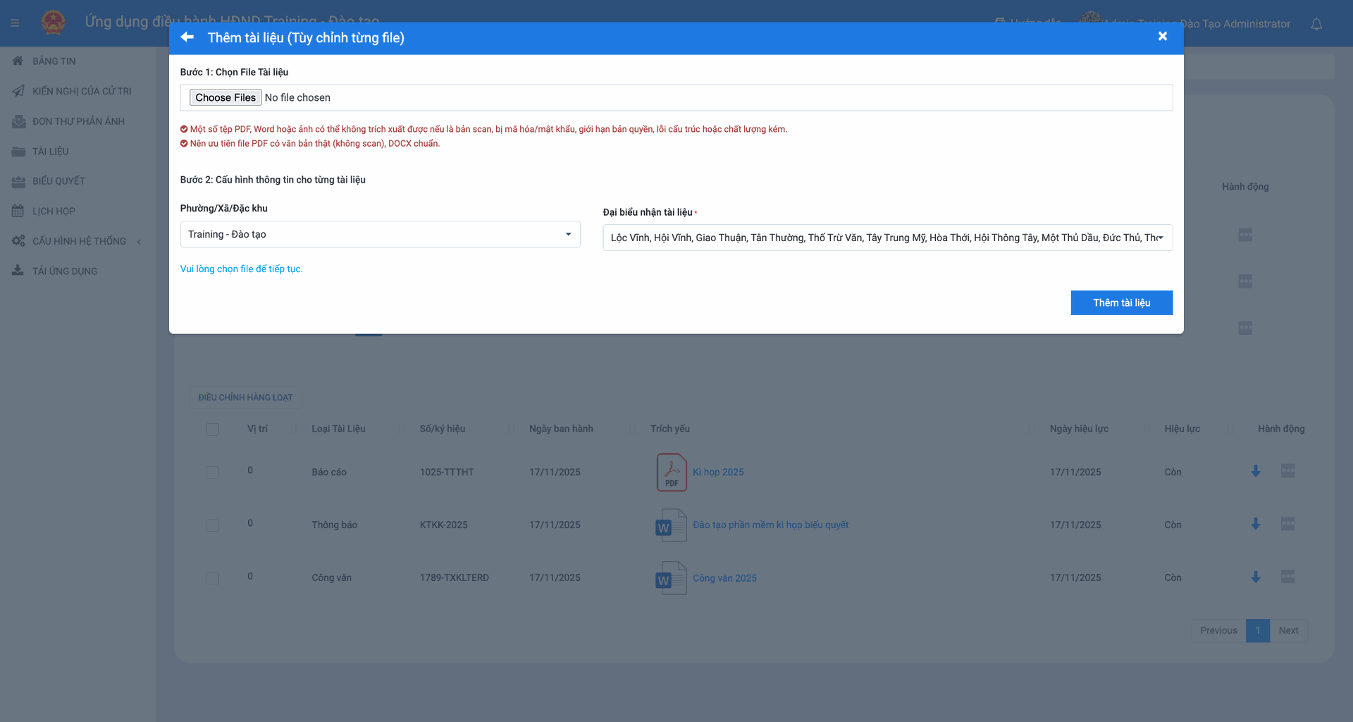 Sau khi hoàn tất, nhấn nút "Thêm tài liệu" để hệ thống tiến hành tải lên và lập chỉ mục dữ liệu.