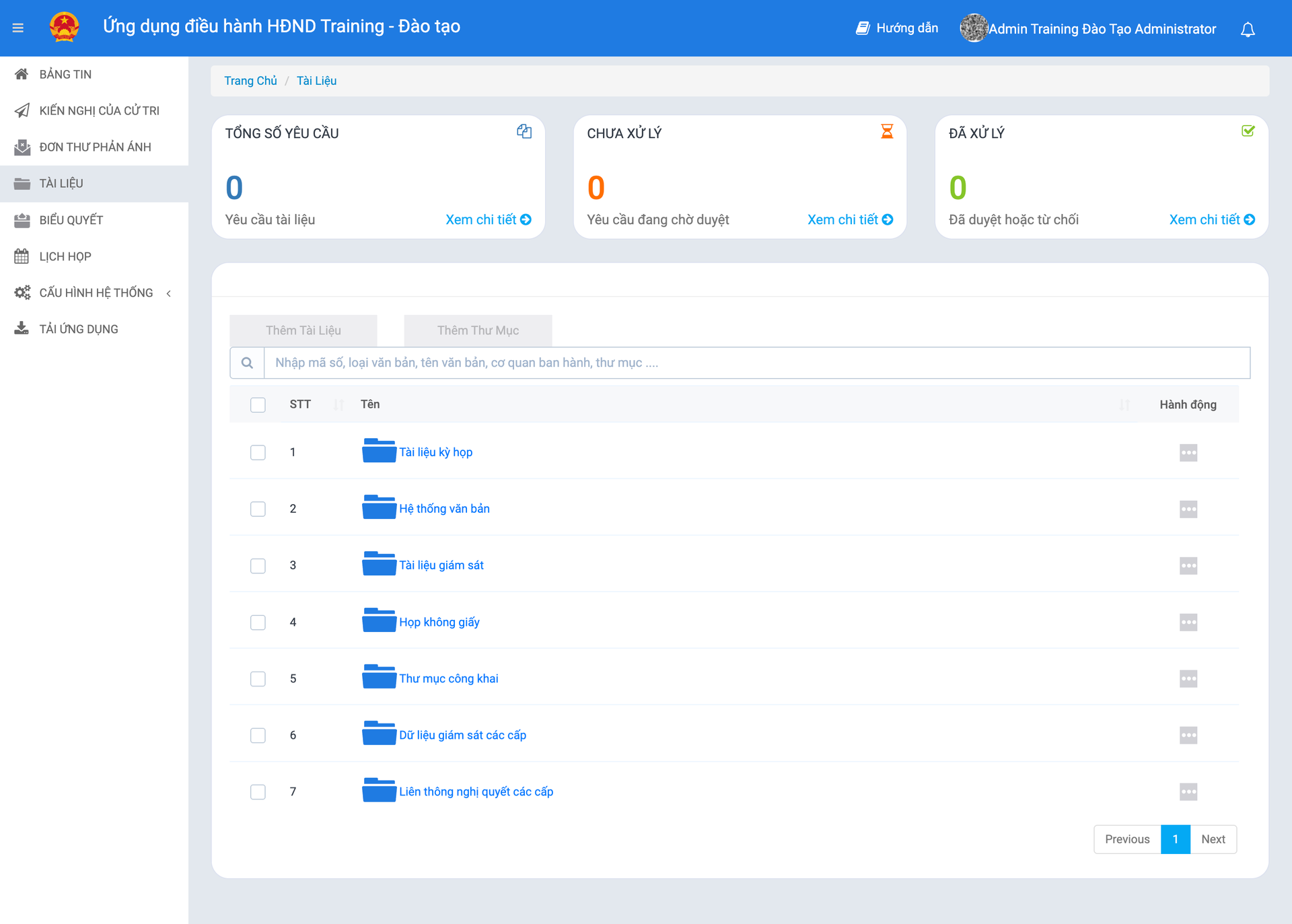 Phía dưới là danh sách các thư mục chính (Root folders), được đánh số thứ tự và phân loại theo chức năng nghiệp vụ của HĐND. Hệ thống mẫu đang hiển thị 7 nhóm tài liệu cốt lõi: