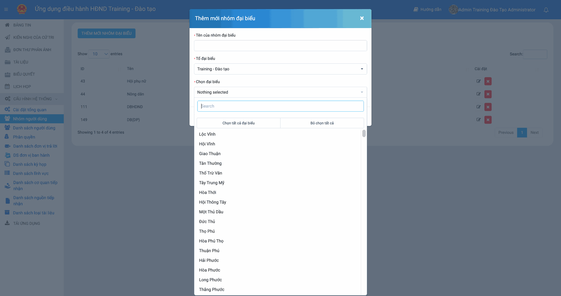 Chọn đại biểu (Quan trọng): Đây là nơi gán thành viên, người dùng vào nhóm.