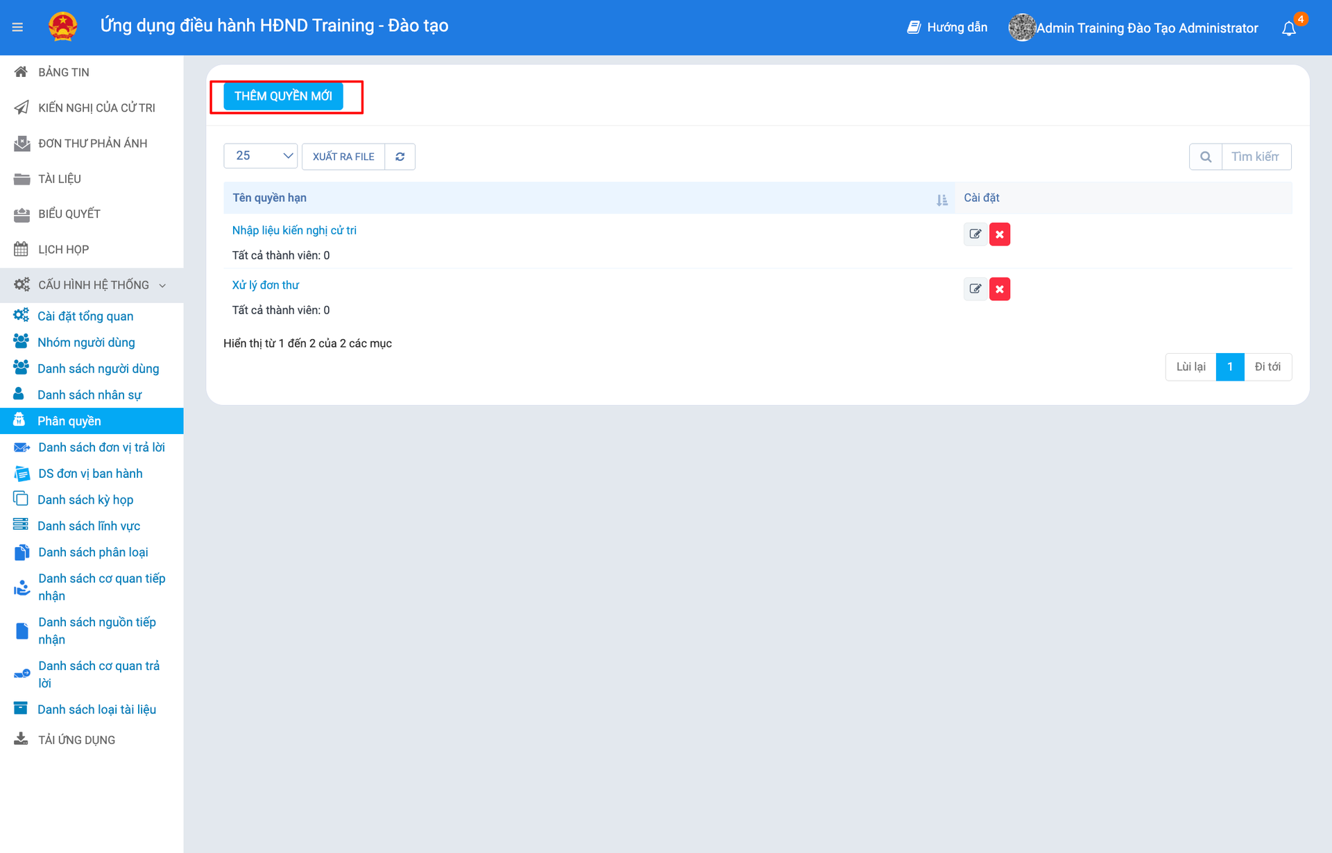 Hệ thống sẽ liệt kê tên các quyền hạn. Nhấn nút "Thêm quyền mới" để tạo một quyền hạn