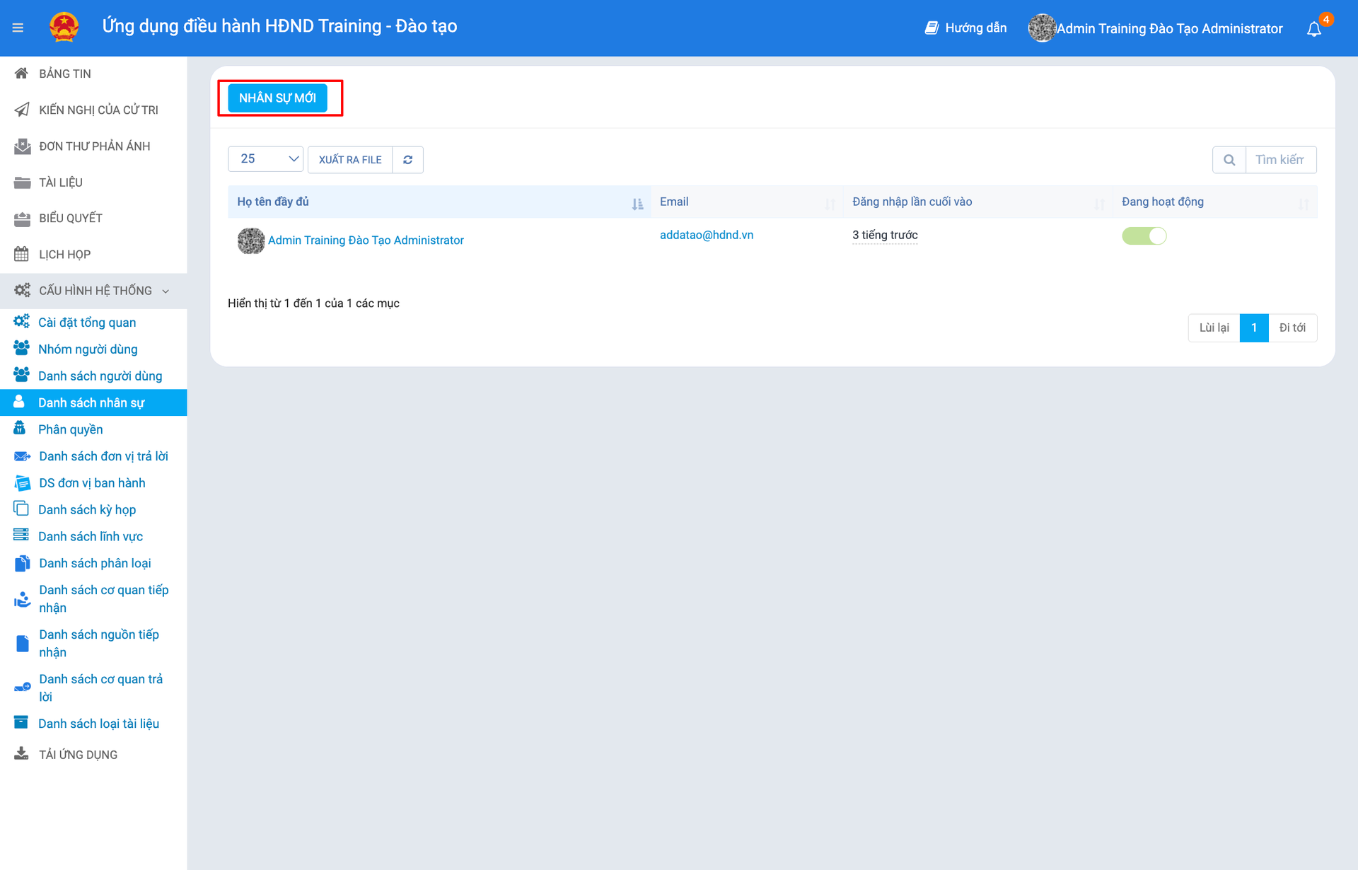 Mục "Danh sách nhân sự" là nơi quản trị viên có thể quản lý danh sách nhân sự có thể truy cập vào hệ thống quản trị để cập nhật tài liệu hoặc truy cập vào các chức năng của hệ thống.