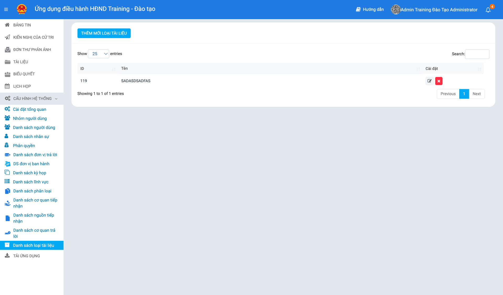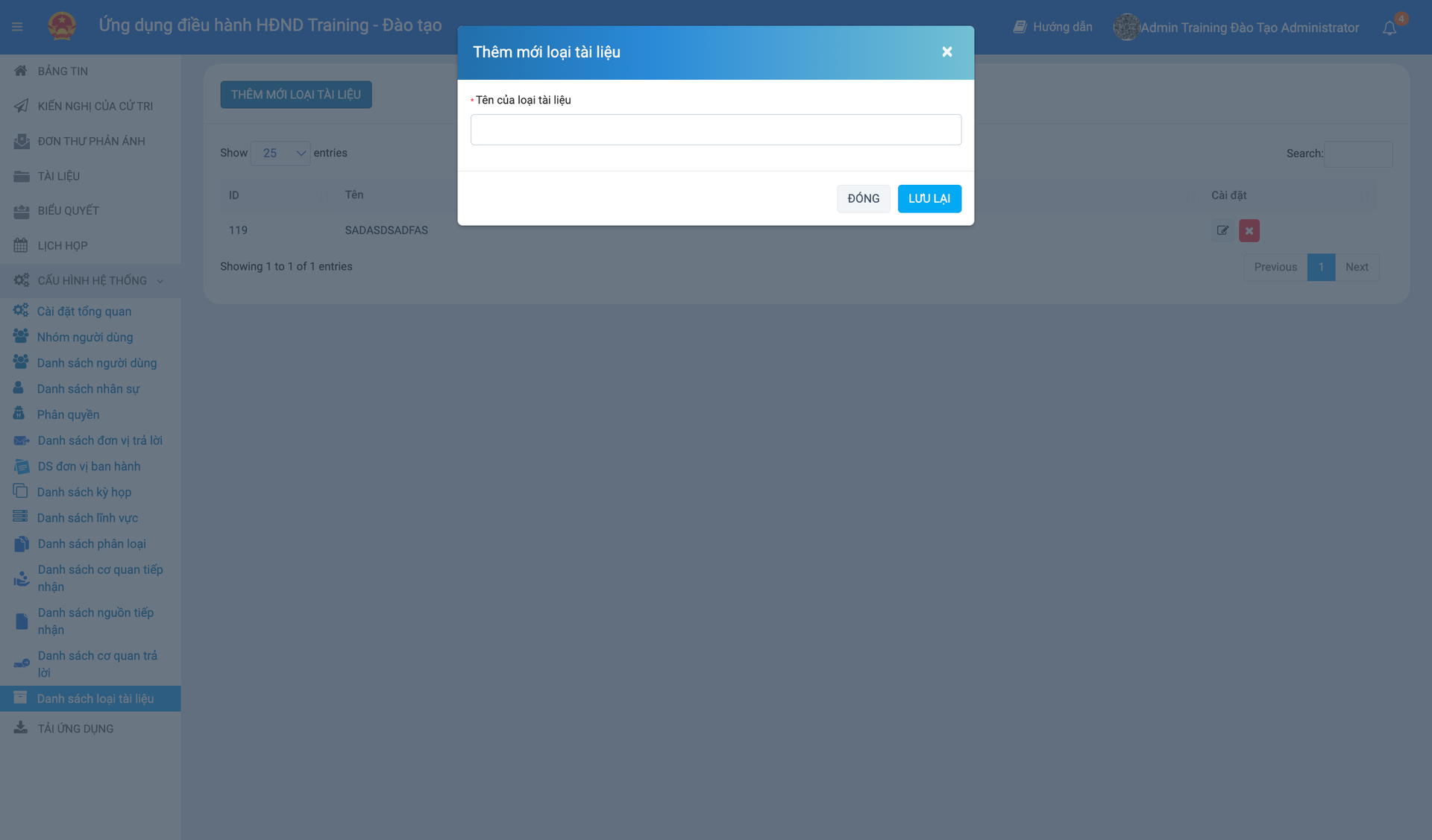 Trong quá trình vận hành, hệ thống sẽ lưu trữ rất nhiều văn bản khác nhau. Để dễ dàng tra cứu và quản lý, Quản trị viên cần thiết lập trước Danh sách loại tài liệu. Danh sách này sẽ đóng vai trò là dữ liệu nguồn cho ô chọn "Loại tài liệu" khi người dùng thực hiện tải file lên.