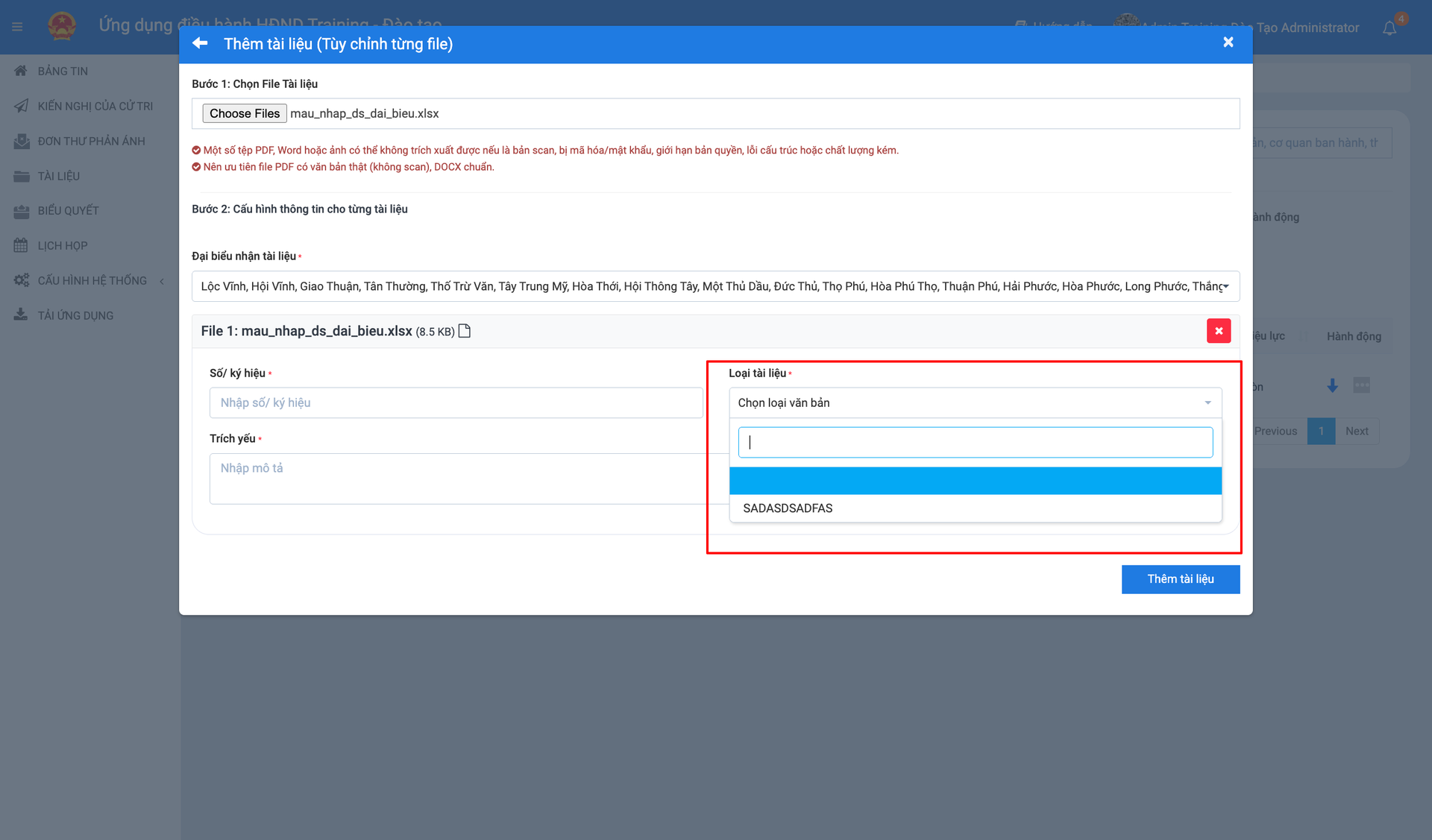 Khi bấm vào ô "Loại tài liệu", hệ thống sẽ xổ xuống danh sách các loại văn bản mà bạn vừa cấu hình (Ví dụ trong hình đang hiển thị loại tài liệu có tên mã là SADASDSADFAS - tên mẫu).